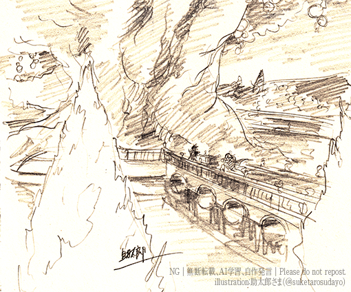 と、大樹から伸びるまっすぐな橋、その先の石畳の道にひとつの姿が浮かび上がっている。