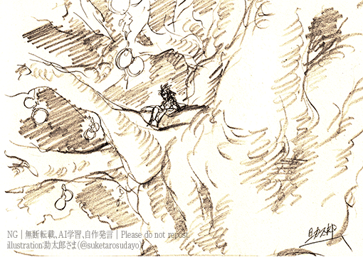ヘクターが腰掛ける大樹の太い枝からの景色は暗い空と、空に浮かぶような大樹の枝の先に付く淡く光る果実がぷかりと浮かんでいる様。